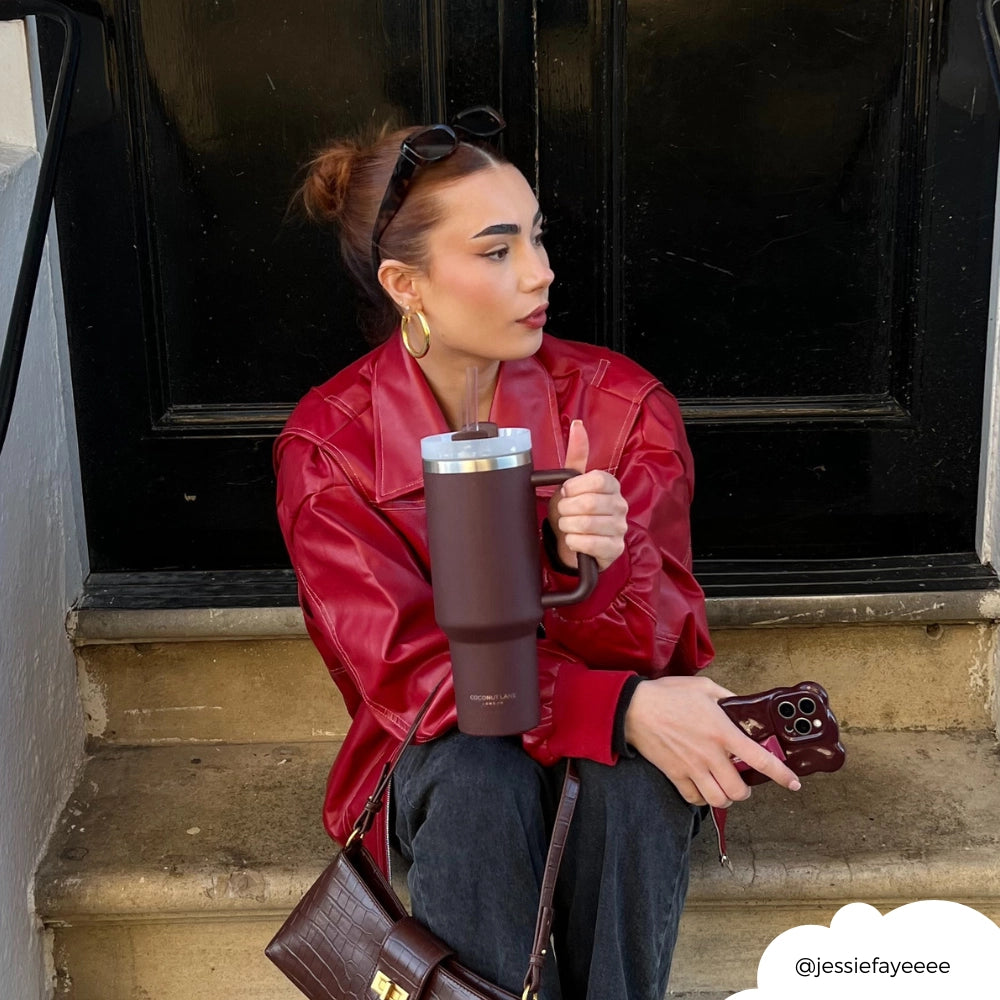 Stainless Steel Tumbler Burgundy gedragen - Mae Lilly