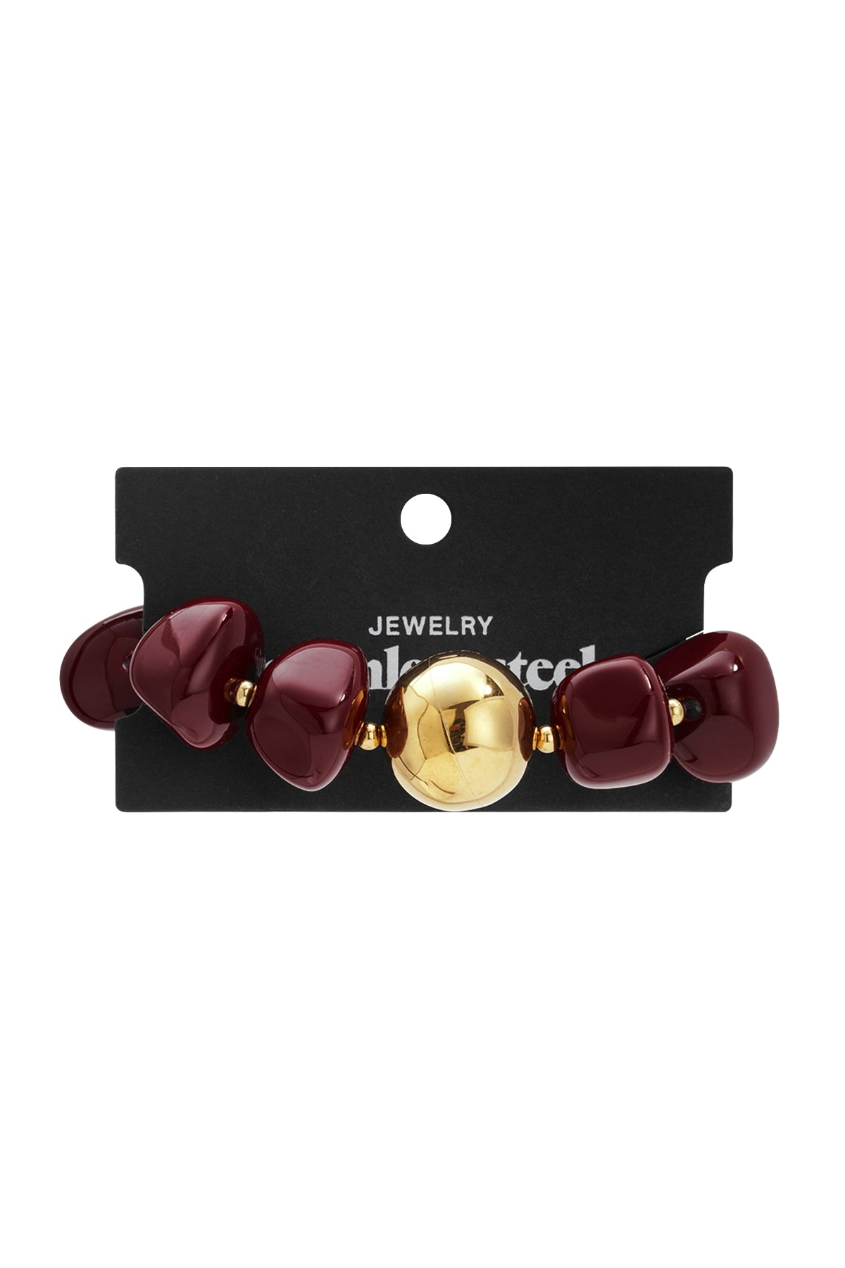 Deze prachtige goudkleurige armband met glanzende bordeauxrode kralen en een centrale gouden bol geeft iedere outfit een luxe finishing touch. Je kunt de armband op zichzelf dragen of combineren met meerdere armbanden.