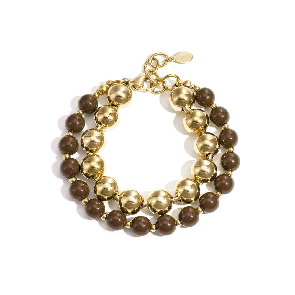 Deze dubbele armband combineert glanzende goudkleurige kralen met mooie warme bruine beads. Mooi om je dagelijkse outfit mee te upgraden en ook prachtig bij een avondlook. Dankzij de verstelbare sluiting kun je de armband, die gemaakt is van acryl en hoogwaardig nikkelvrij, waterproof en hypoallergeen stainless steel (roestvrijstaal) materiaal, dragen van 17 t/m 20 cm.