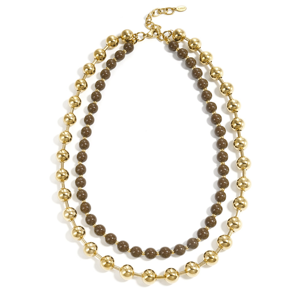 Deze dubbele ketting combineert glanzende goudkleurige kralen met mooie warme bruine beads. Leuk om je dagelijkse outfit mee te upgraden, maar ook prachtig bij een avondlook. Dankzij de verstelbare sluiting kun je de ketting, die gemaakt is van acryl en hoogwaardig nikkelvrij, waterproof en hypoallergeen stainless steel (roestvrijstaal) materiaal, dragen van 45 t/m 50 cm.