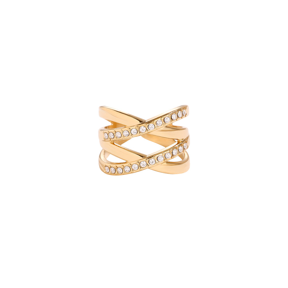 Deze goudkleurige ring is een echte eyecatcher met het elegante kruislingse design met fijne steentjes. Mooi om solo te dragen als statement, of juist te combineren met subtiele ringen voor een classy stacked look. De ring is gemaakt van hoogwaardig nikkelvrij, waterproof en hypoallergeen stainless steel (roestvrijstaal) materiaal dat niet verkleurt.