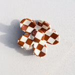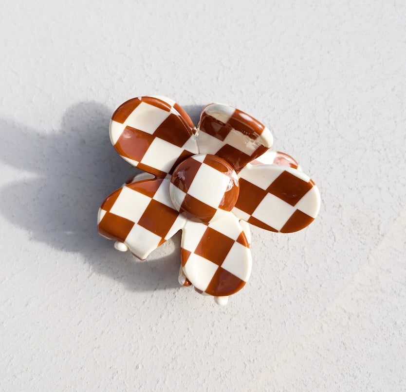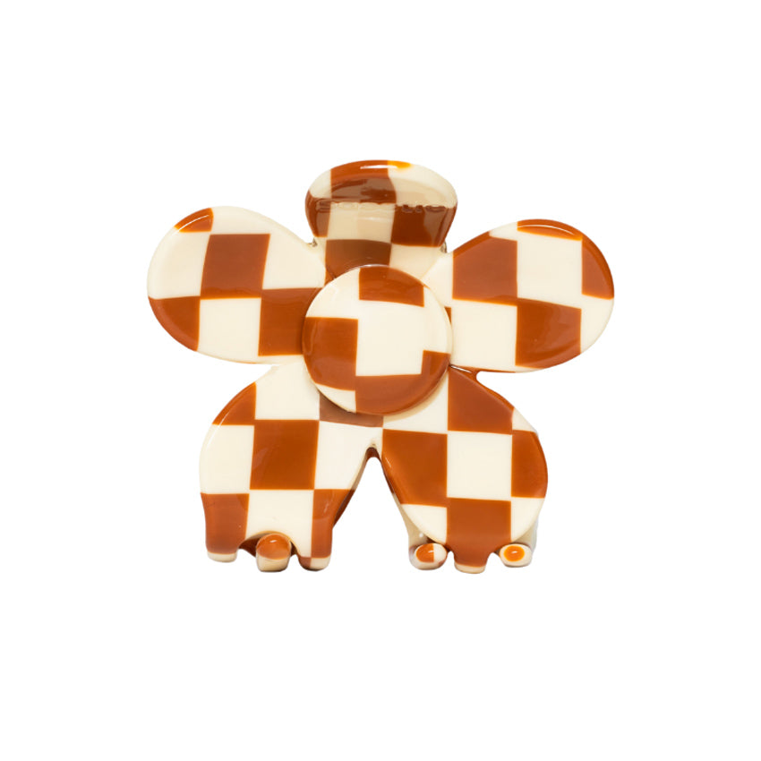Natuurlijk is het dan wel zo leuk als je een mooi en bijzonder exemplaar zoals deze met bloem vorm en een leuke crème/camelbruin geblokte print draagt, toch?