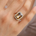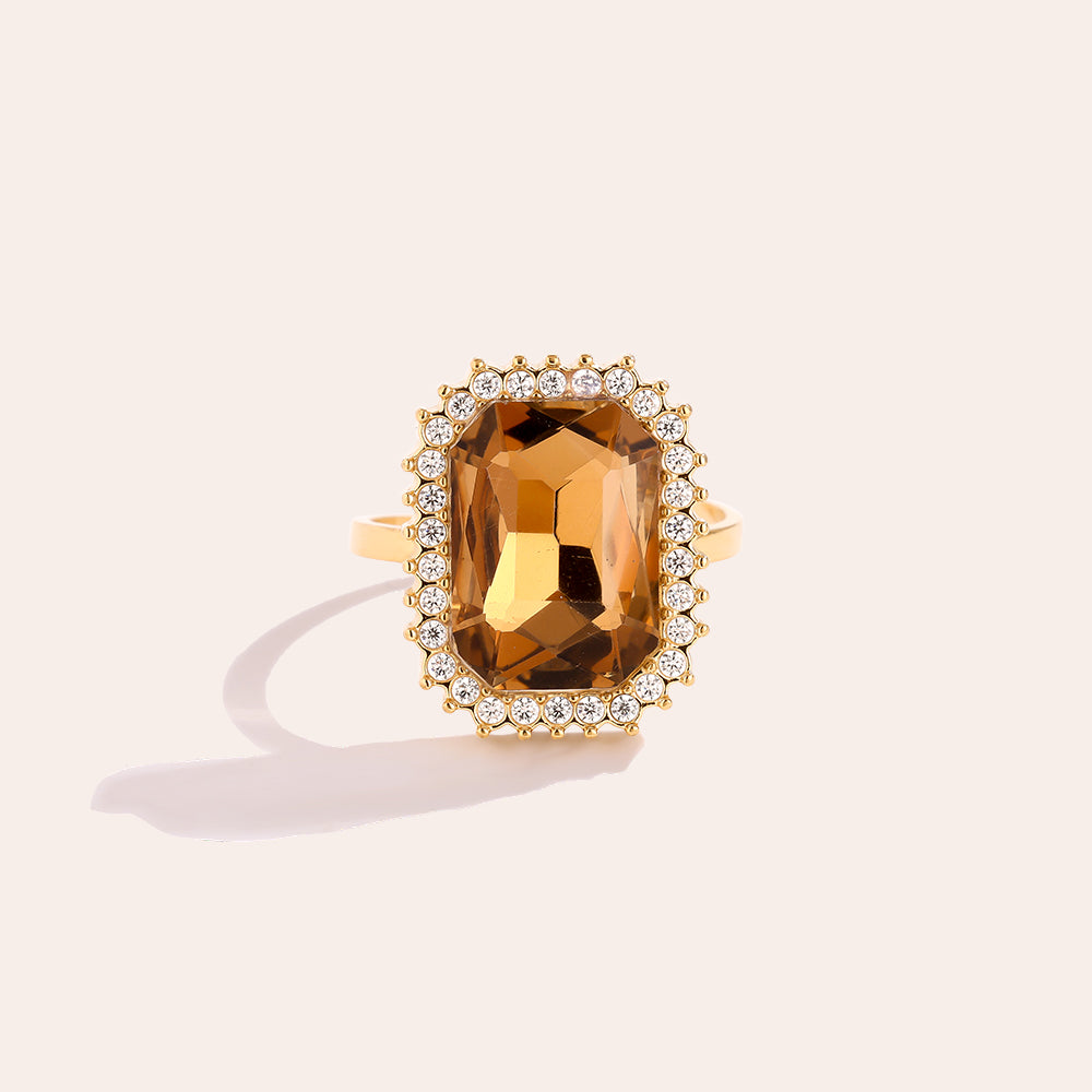 Deze mooie (verstelbare) statement ring straalt pure glamour uit! De grote amberkleurige steen in rechthoekige slijpvorm is omlijst door allemaal fonkelende steentjes, wat zorgt voor een luxe vintage vibe met een moderne finishing touch.