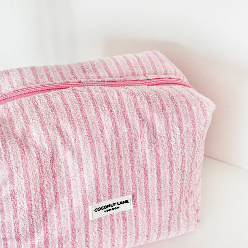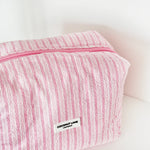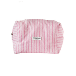 Praktisch én stijlvol is deze superzachte Make-up Tas Powder Stripes! Met het mooie minimalistische design met wit/roze strepen staat deze beauty ook nog eens heel mooi op je kaptafel of badkamermeubel! De lichtgewicht bag biedt ruimte genoeg om al je dagelijkse essentials (make-up maar ook office of school essentials), in te bewaren en te vervoeren.