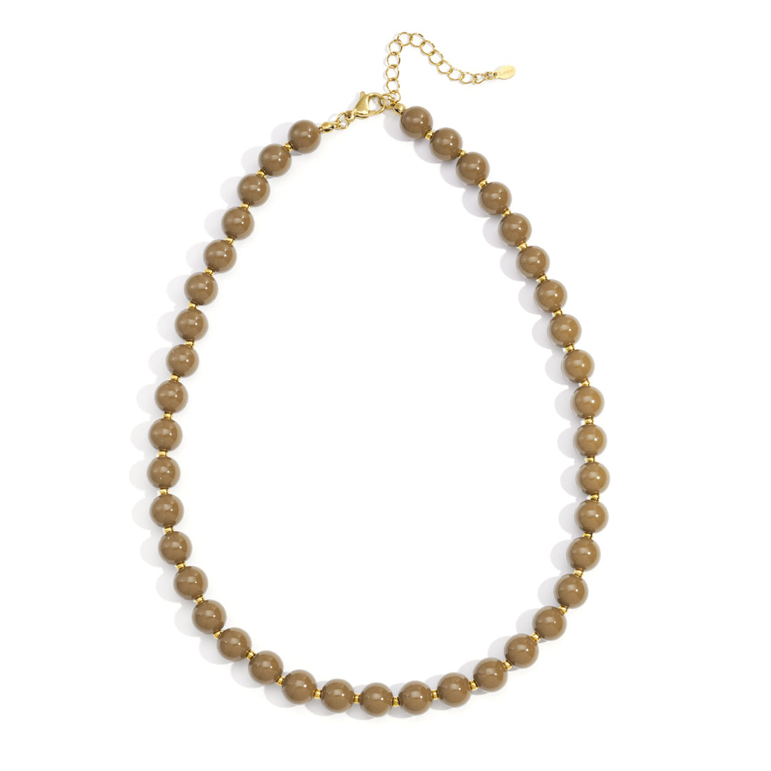 Deze zachtbruine kralenketting met glanzende kralen is heel mooi om solo te dragen als eyecatcher of te combineren met andere kettingen voor een zogenaamde layered look. Geschikt voor zowel dagelijks gebruik als speciale gelegenheden. Het goudkleurige kettinkje is gemaakt van hoogwaardig nikkelvrij, waterproof en hypoallergeen stainless steel (roestvrijstaal) materiaal dat niet verkleurt.