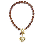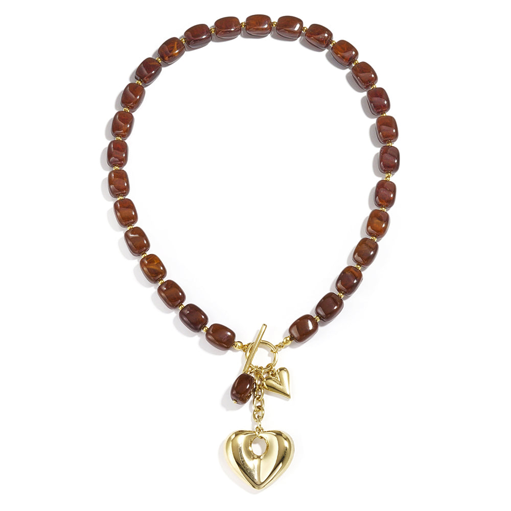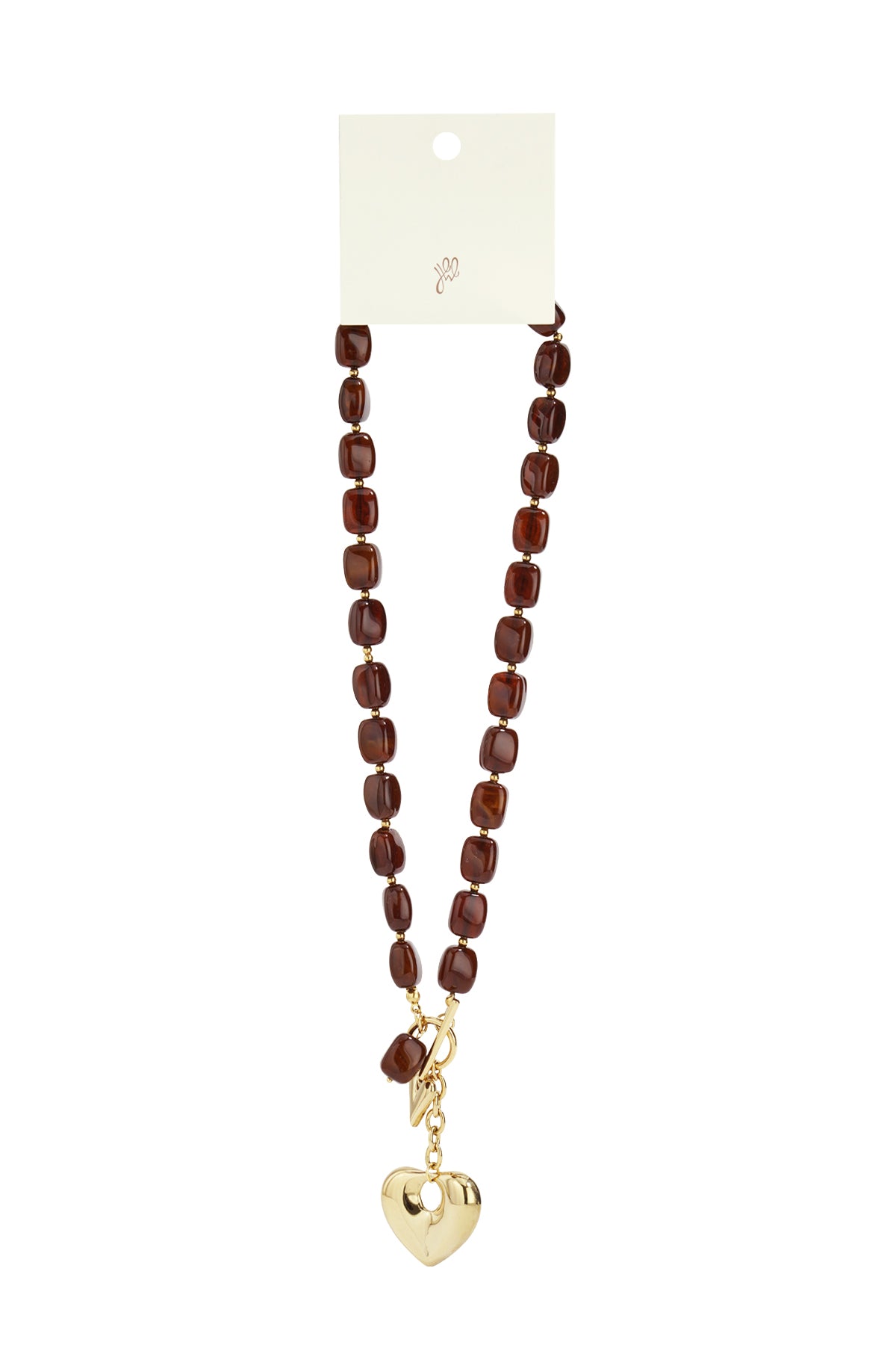 Deze ketting combineert warme bruintinten met een elegante gouden hartbedel. De glad afgewerkte kralen geven de ketting een zachte, luxe uitstraling, terwijl de gouden details zorgen voor een gaaf accent. De ketting is leuk om solo te dragen als statement piece of te combineren met andere kettingen voor een gelaagde look. Gemaakt van hoogwaardig hypoallergeen, waterproof en nikkelvrij stainless steel (roestvrijstaal) materiaal dat niet verkleurt.