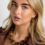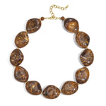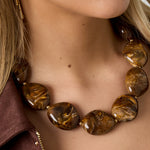 Deze mooie chunky ketting combineert moderne eenvoud met natuurlijke, warme tinten. De amberkleurige pebble stenen hebben een zachte marmerlook en de goudkleurige details maken het ontwerp net wat verfijnder. Draag de ketting solo voor een clean look of combineer deze met andere kettingen voor een extra statement. De ketting is verstelbaar in lengte en te dragen van 45 t/m 52 cm.  Het goudkleurige kettinkje is gemaakt van hoogwaardig hypoallegeen, waterproof en nikkelvrij stainless steel (roestvrijstaal) materiaal dat niet verkleurt.